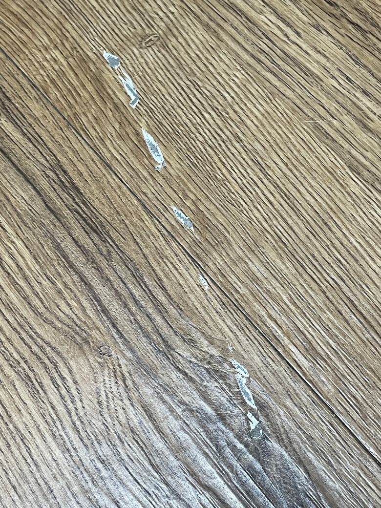 다이소에 가면 바닥보수 제품 있습니다. 그걸로 살짝 보수하면 표가 안 날꺼 같습니다.