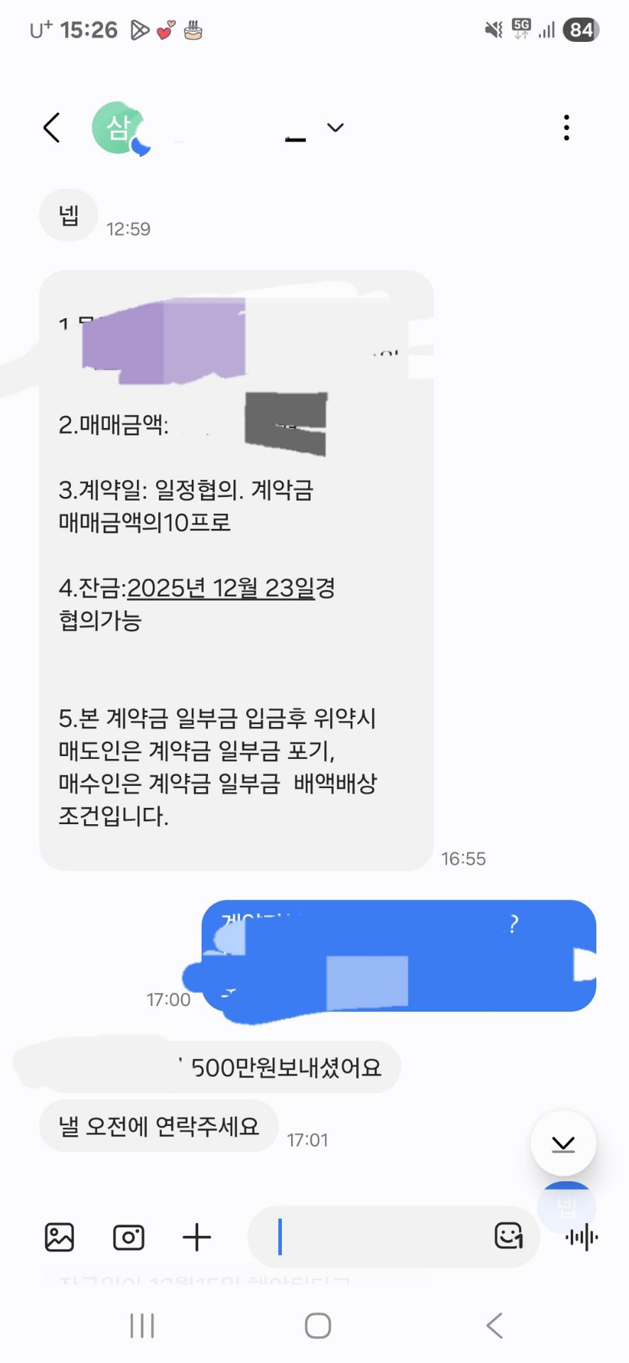 - 문자를 받고나서 가계약금을 받았고 그 후에 잔금 날짜가 12월 15일로 바뀜