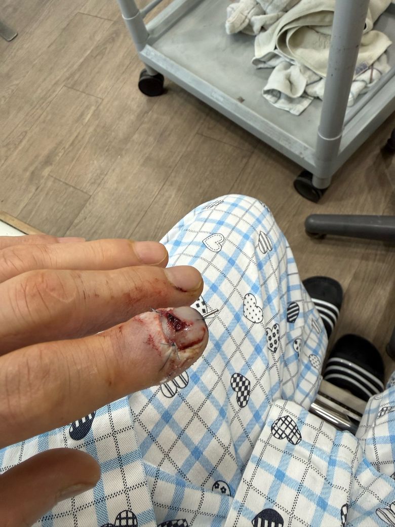 사진상으로는 손가락 말단부 개방성 골절 및 열상 봉합 상태로 보이며, 금속 고정(핀 삽입)이 시행된 전형적인 산업재해 손상 형태입니다. 이 경우 치료 경과가 비교적 길고 합병증 관리가 중요합니다.