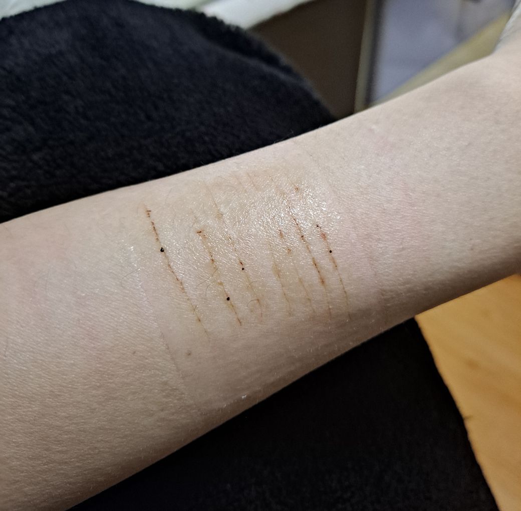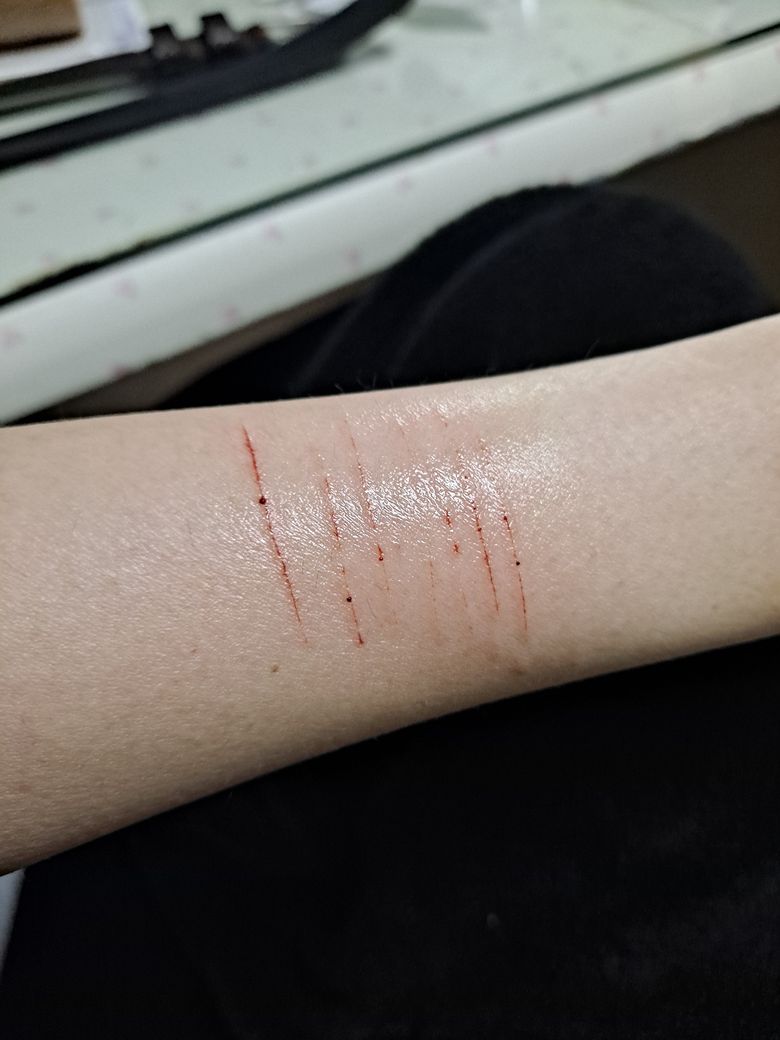첫 번째 사진이 2월 17일날에 한거고 두 번째가 그저께 찍은거거든요. 자해하고 바로 소독하고 지금까지 계속 갈아주면서 연고 바르고 습윤 드레싱 붙이고 떼어지지 않게 붕대도 살짝 감아놨거든요. 여태 물도 계속 안 닿아서 냄새나고 가려워요. 언제까지 붙여놔요? 물로 헹궈도 되나요? 이제 샤워할때 붕대 메디폼 다 떼고 해도 될까요?