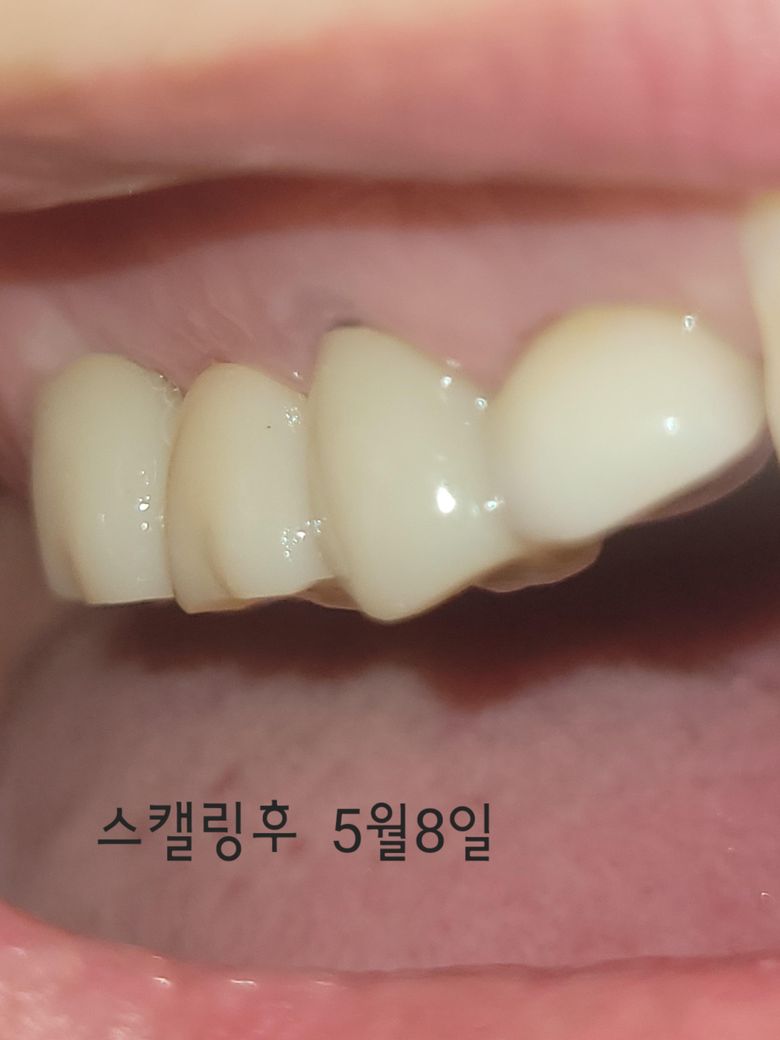 스케일링 후 1주 정도 지나면 다시 잇몸이 회복되면서 덮힐 정도의 미약한 일시적 퇴축 같습니다. 지금 사진상으론 특별히 문제가 없어보입니다.