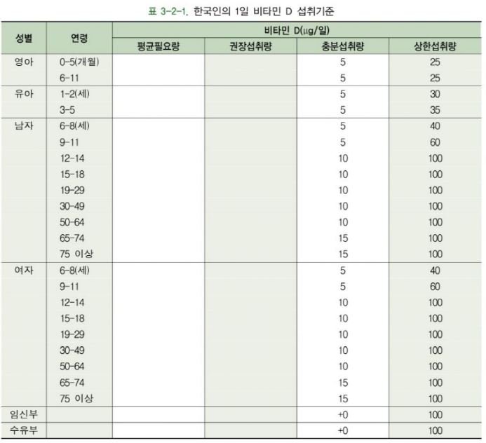 표의 섭취량 ‘마이크로그램 단위’의 값에서 40을 곱하면 ‘IU 단위’가 됩니다.