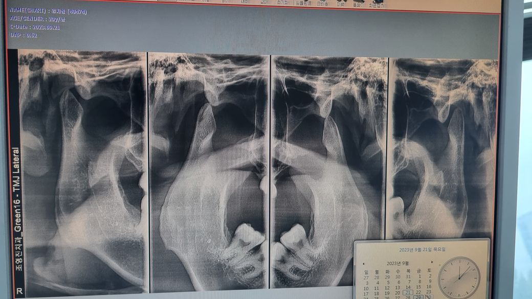 방사선 사진을 통해 보기로는 턱관절의 osteophyte(골성융기)가 의심됩니다. 뼈에 과도한 힘이나 염증 자극에 의해 뼈 모양이 칼날 모양으로 변형되는 것입니다.