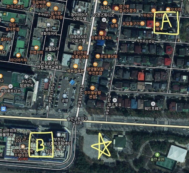 추가적으로, 당시 축제가 진행된 공원 바로 옆에는 35층짜리 고층 아파트(그림의 B)가 있는데요. 그 아파트 층고를 4m라고 가정해봐도 35층(top 층)과 공원과의 거리가 길어야 160m를 못 넘겨요(높이 140m, 아파트 1층 입구와 공원과의 거리를 최대 40m라고 감안하더라도). 그러면 top층인 35층에서 들리는 소리는 더 크게 들릴까요? 혹시 과학적인 원리에 의해 소리가 옆으로 이동하는 거랑 위로 이동하는 거에 차이가 생겨서 거리가 가까운데도 오히려 작게 들리고 이러는 건 아니겠죠?