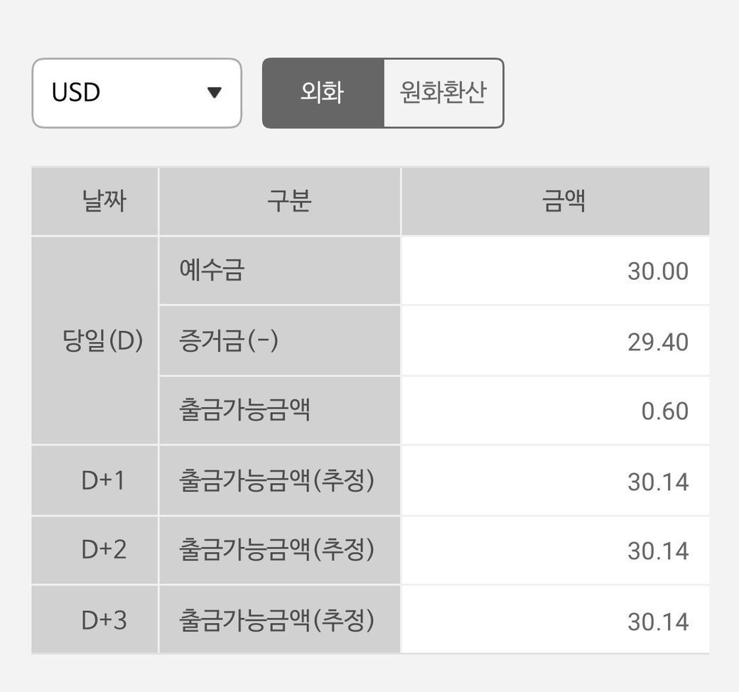 나무증권 30달러 이벤트 저번주 금요일에 매수 매도 했고 출금가능추정이 저렇게 나와있는데 보통 매수매도하면 당일 예수금은 0달러가 되야하는거 아닌가요 ?? 아니면 내일 출금 가능한지