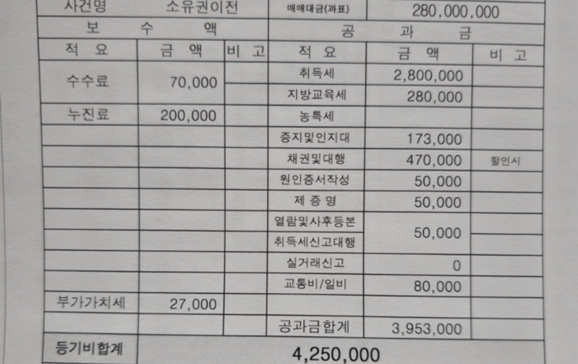 통상적으로 매매를 할 경우 취등록세하고 인지세 채권등을 매입을 하고 왼쪽의 경우 법무사 대행에 대한 수수료라고 보시면 됩니다. 감사합니다.