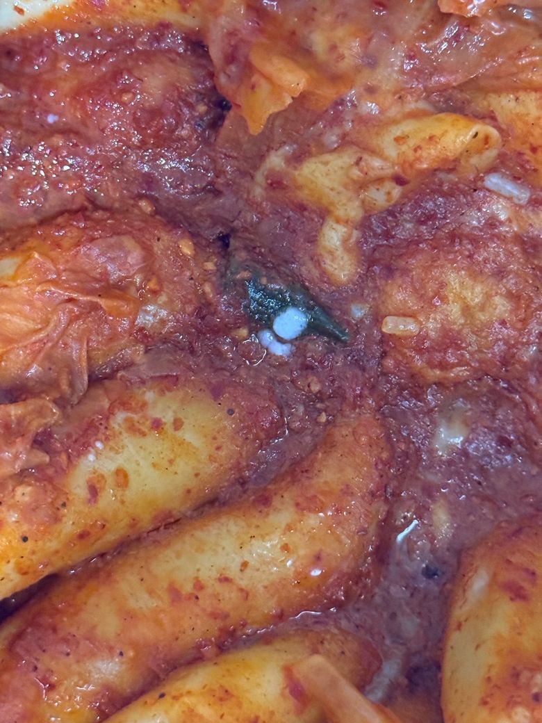 떡볶이를 보관하셨는데 뭐가 보인다고 하셨죠 이것은 곰팡이는 아닙니다 이것은 약간 돼지고기 기름 같은 기름