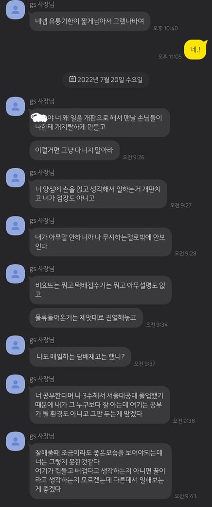이전에 근무 관련해서 제가 잘 못하거나 이런 피드백은 약 5개월 전 한번 받았고 그 피드백 맞게 근무를 하였습니다 이후 점장님께선 별다른 말씀 없으시다가 갑자기 이렇게 연락오셨습니다