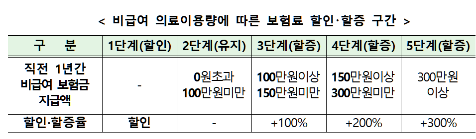 ㅇ 직전 1년간 비급여 지급보험금에 따라 5등급으로 구분하여 비급여(특약)의 보험료가 할인․할증됩니다.