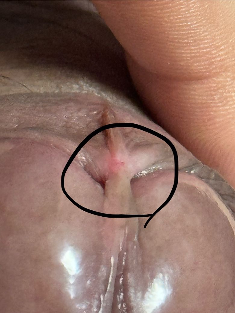 포피소대가 과하게 늘어났거나, 긁히는 등 미약한 상처가 있는 것으로 보입니다.