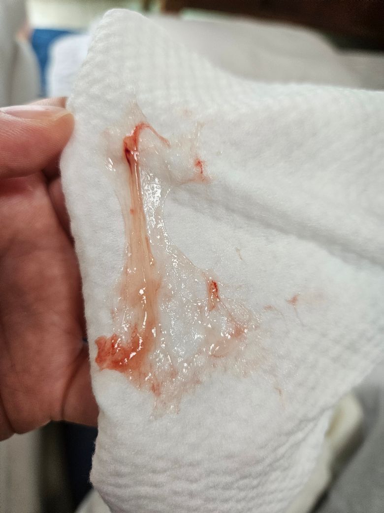 현재 출혈이 동반된 점액성 콧물이 다량으로 보입니다.