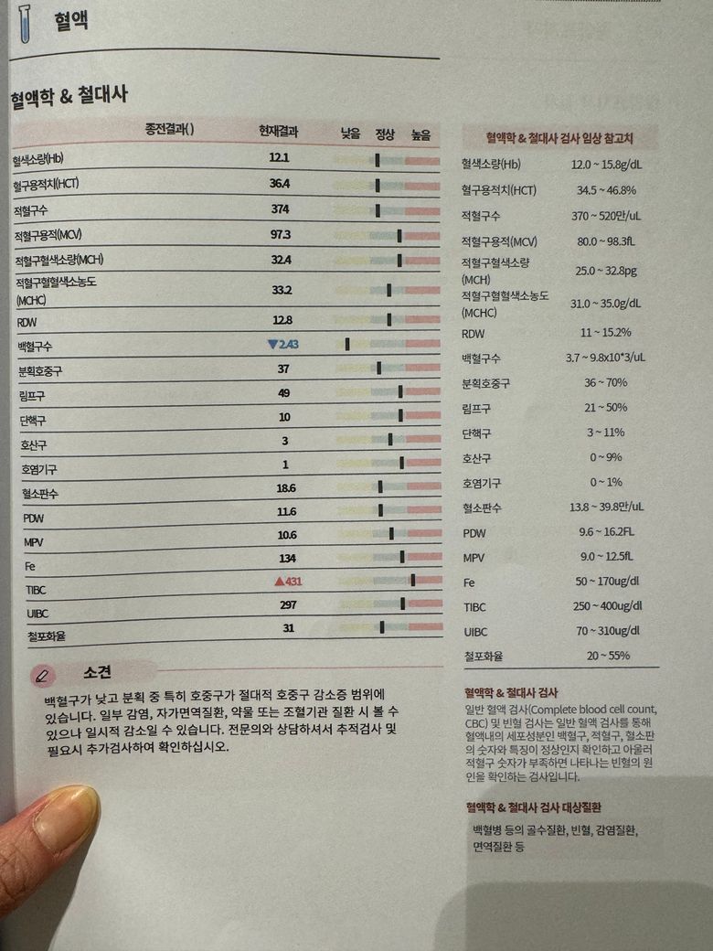 매년 건강검진을 하면 백혈구 수치가 적다고 나와서스트레스입니다. 호중구도 절대적호중구 감소 수치범위에 있다는데 문제있는건지 걱정됩니다. 어떻게 해야 백혈구 수치가 좋아질까요?