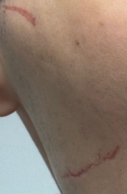 손톱에 긁혀서 얼굴, 목 등 여러곳에 상처를 입었습니다..