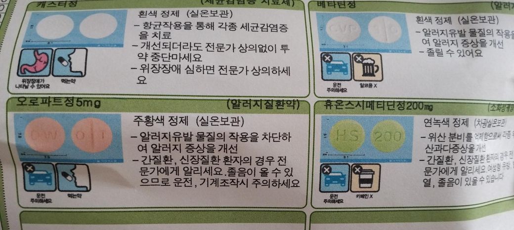 처방받으신 약 중에 항히스타민 성분의 약들(오로파트, 베타틴정)이 건조함을 유발할 가능성이 있습니다.