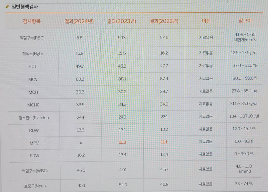 혈액검사 결과에서 MPV 수치가 올해에는 체크가 되지 않았으나, 작년 재작년 모두 기준치를 초과하였습니다.