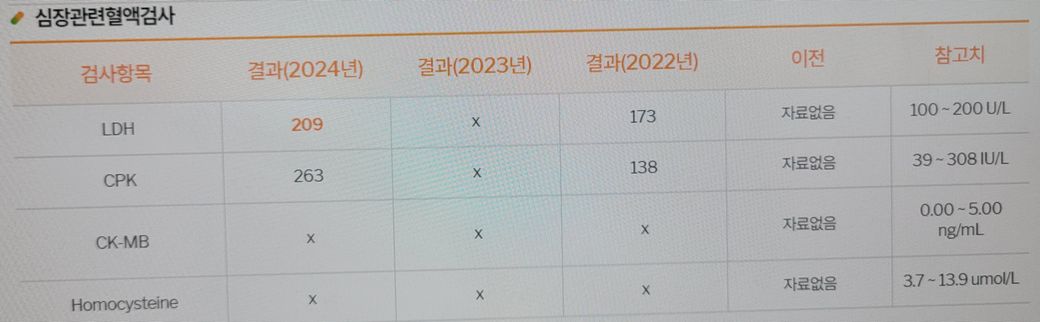 심장혈액검사에서 LDH 수치와 CPK 수치가 기준치를 초과하거나 작년 재작년대비 급격히 상승하였습니다.