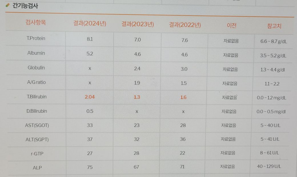 간기능검사시 총빌리루빈 수치가 22년 대비 점점 수치가 올라서 올해는 기준치를 초과하였습니다.