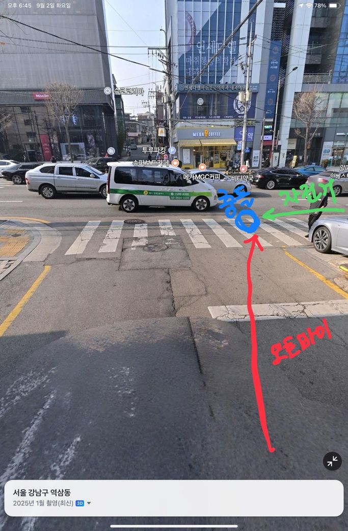 매일 자전거로 출근합니다. 인도에서 인도로 가는 횡단보도 건너는 중 골목에서 나오는 오토바이가 속도를 내며 자신의 우측은 보지 않고 오는 듯해서 브레이크를 밟고 멈추는데 충돌이 일어납니다. 당시 상황은 사진으로 설명하겠습니다.