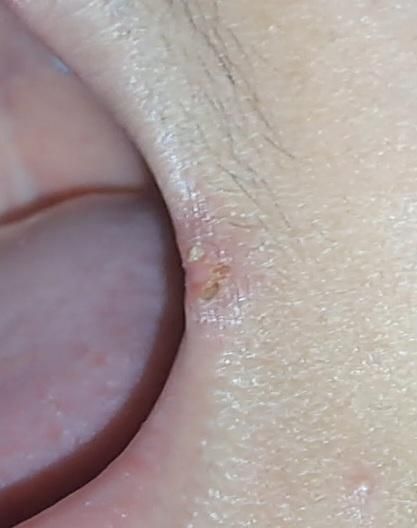 감별로는 단순포진도 고려할 수 있으나, 통증이 심하지 않고 군집 수포 형태가 없으며 진행 양상이 비교적 경미해 가능성은 낮아 보입니다.
