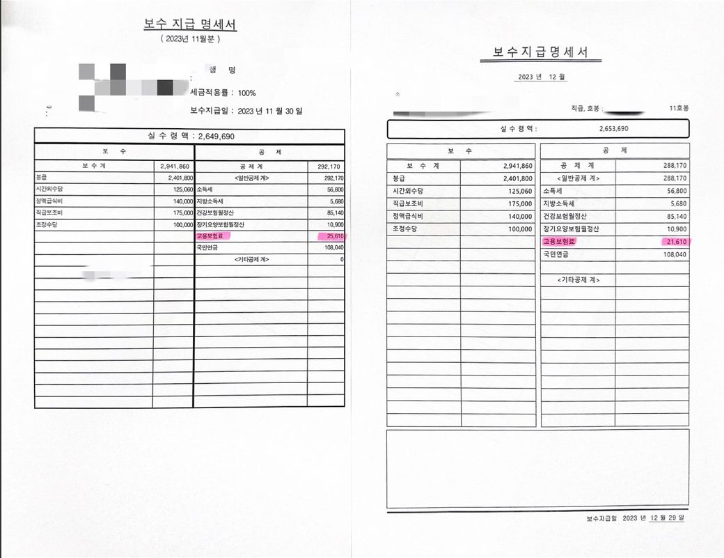 질문 2. 저의 급여 명세서 사진 보시면 저의 명세서 인데 11월 분 12월분 고용보험료가 금액이 다른데