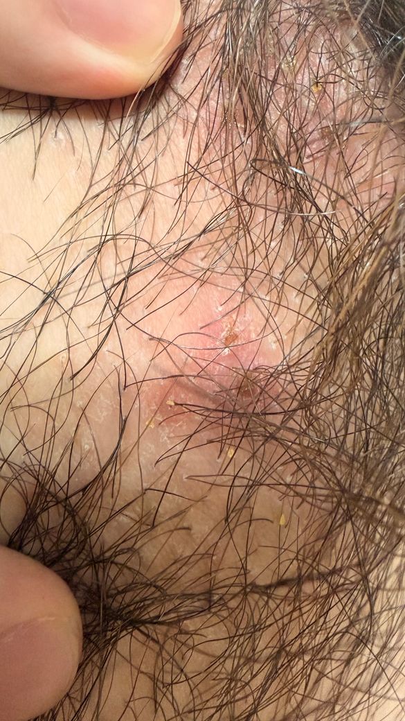 감별해야 할 다른 원인으로는 모낭염이나 초기 세균 감염이 있으며, 이 경우 만지면 아프고 국소 통증이 비교적 뚜렷합니다. 사타구니 백선 같은 진균 감염은 대개 가려움이 주증상이고 경계가 비교적 뚜렷해 현재 사진과는 다소 양상이 다릅니다. 헤르페스 등 성병은 물집이나 궤양이 뚜렷한 경우가 많아 현재 소견만으로는 가능성이 낮아 보입니다.
