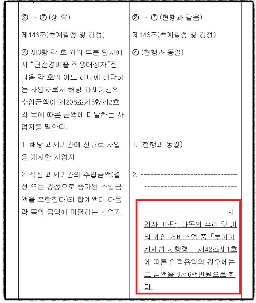 “영세 인적용역사업자의 세부담 완화를 위해 단순경비율 적용기준 수입금액을 상향, 2400만원 -> 3600만원”