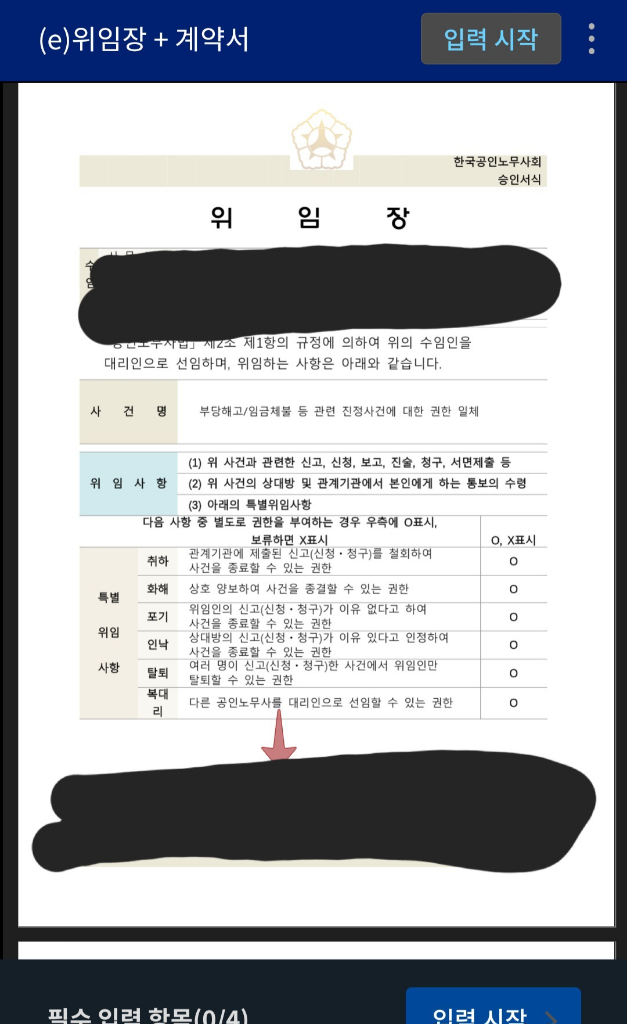 통상 사용하는 위임장과 계약서 입니다. 다만 노무사사무실에 연락하여 구체적인 금액에 대해서는 명확히 약정을 하시길