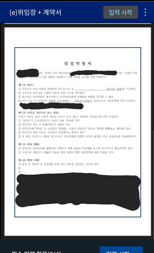 위임약정서에 착수금이나 성공보수에 관한 것이 모두 기재된 상태에서 서명을 하는 게 맞습니다.