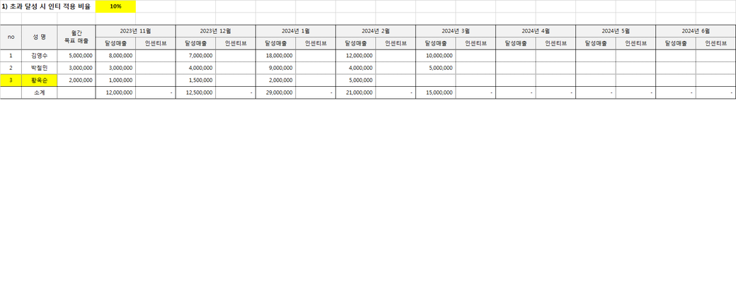 - 즉, 황옥순의 경우 2023년 11월~2024년 1월까지는 목표 매출 200을 초과하지 못했으므 인센티브 지급 없음