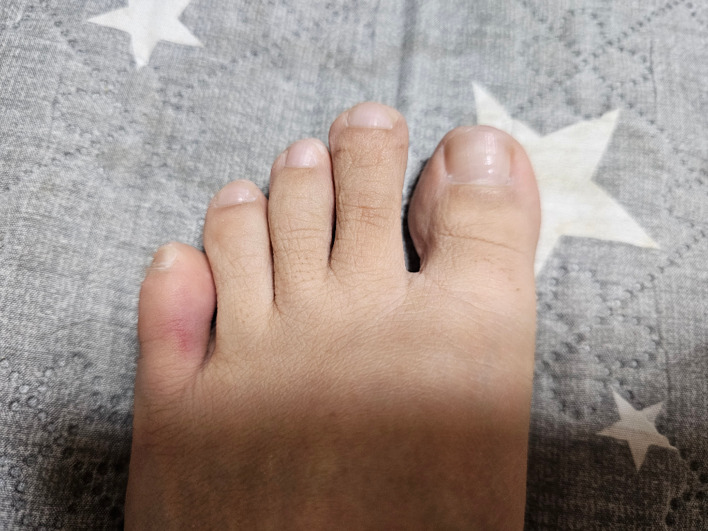 멍과 발적이 관찰되는 상태입니다. 통증이 쉽게 나아지지 않는다면 골절이나 인대손상 등에 대한 확인이 필요하므로 가까운 정형외과를 방문해보시고, 통증이 호전되는 양상을 보이면 1-2주 기다려보실 수 있습니다.