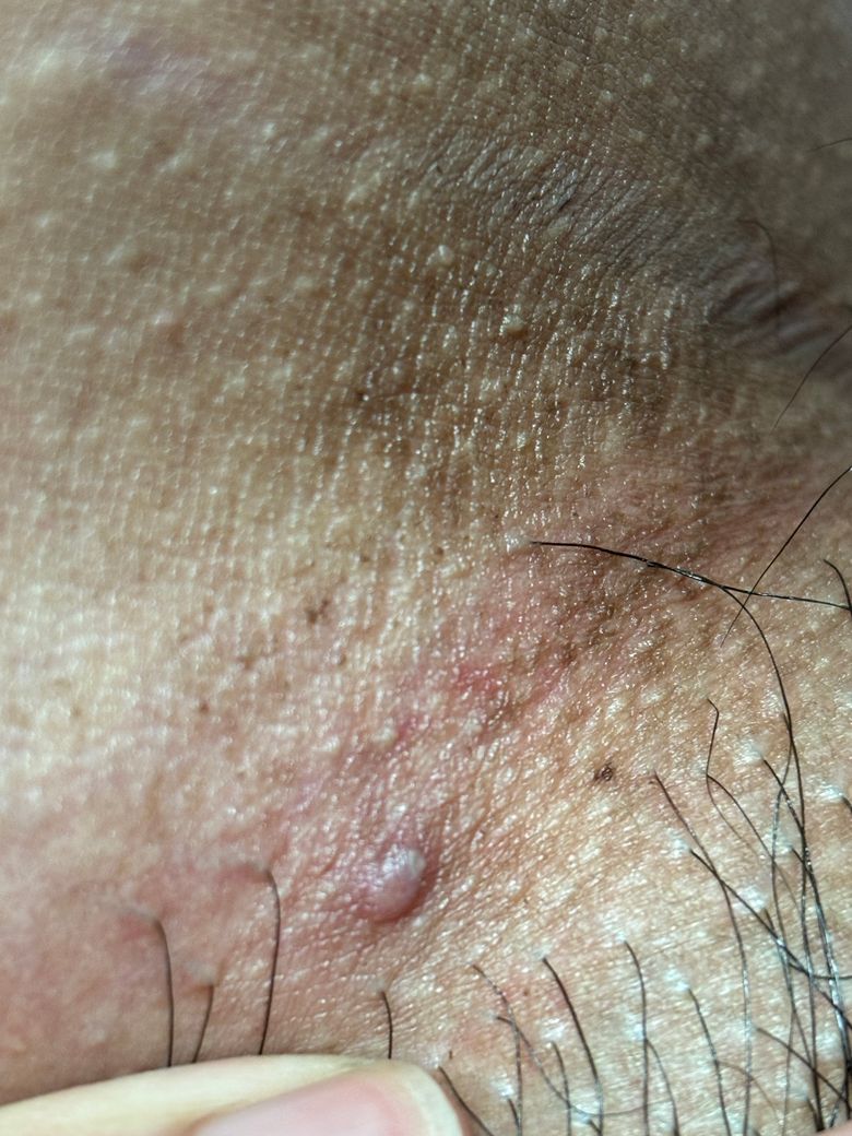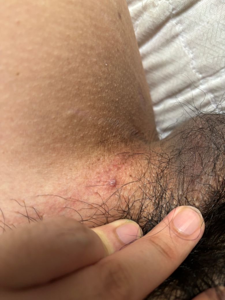 병변의 모양새로 보아 헤르페스도 곤지름도 가능성이 낮습니다. 단순한 모낭염 등의 피부염일 가능성이 높아보이고 잘 해결되지 않으면 피부과나 비뇨의학과를 방문해보시기 바랍니다.