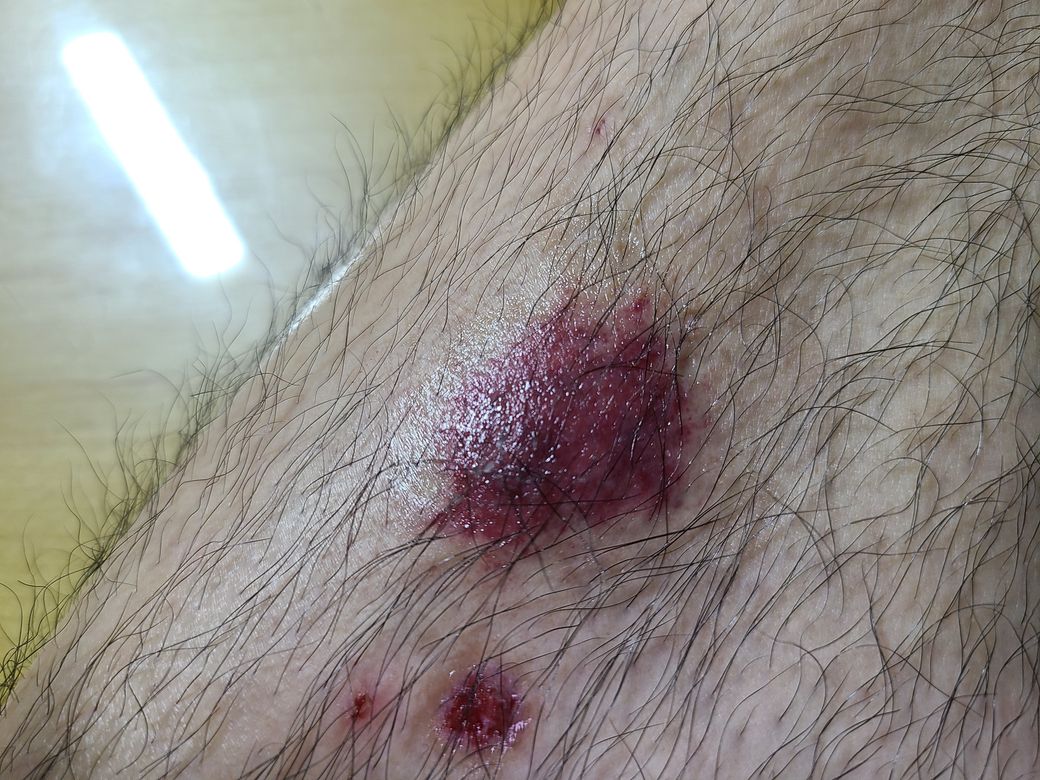 질문하신 내용에 대하여 아래와 같이 답변 드립니다.우선은 피멍도 같이 들어있는것 같네요. 까진 피부라면 상처 관리 잘해주어야 합니다.