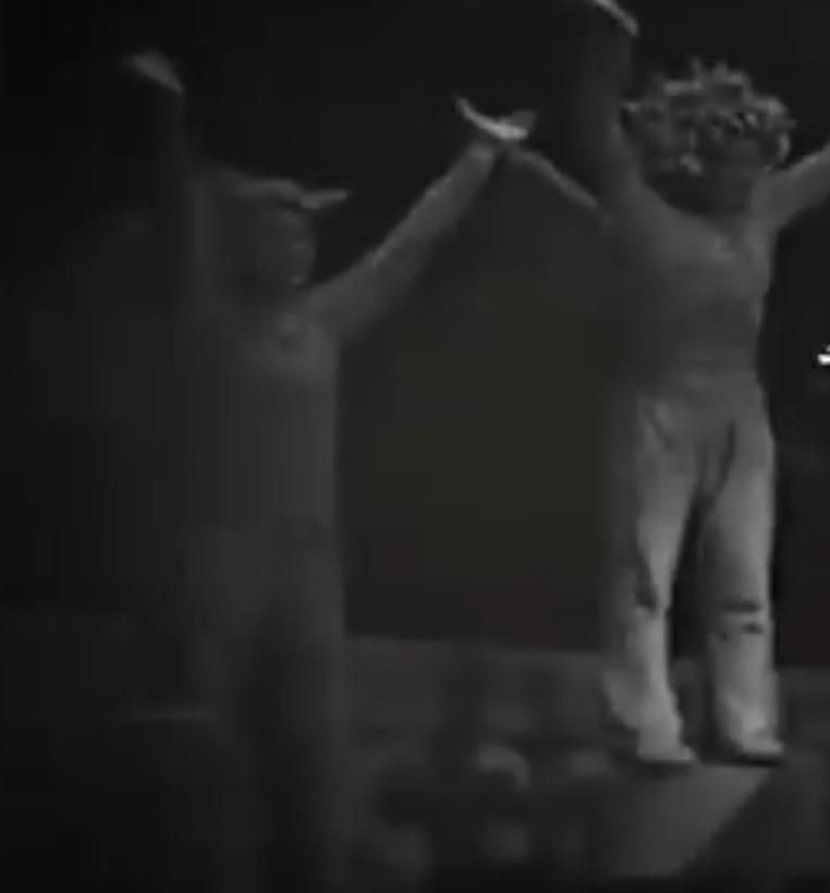 이 흑백영화는 악마와 천사같은 신을 닮은 복장을 입고 손을 들며 연기하는 고전영화 같아요.