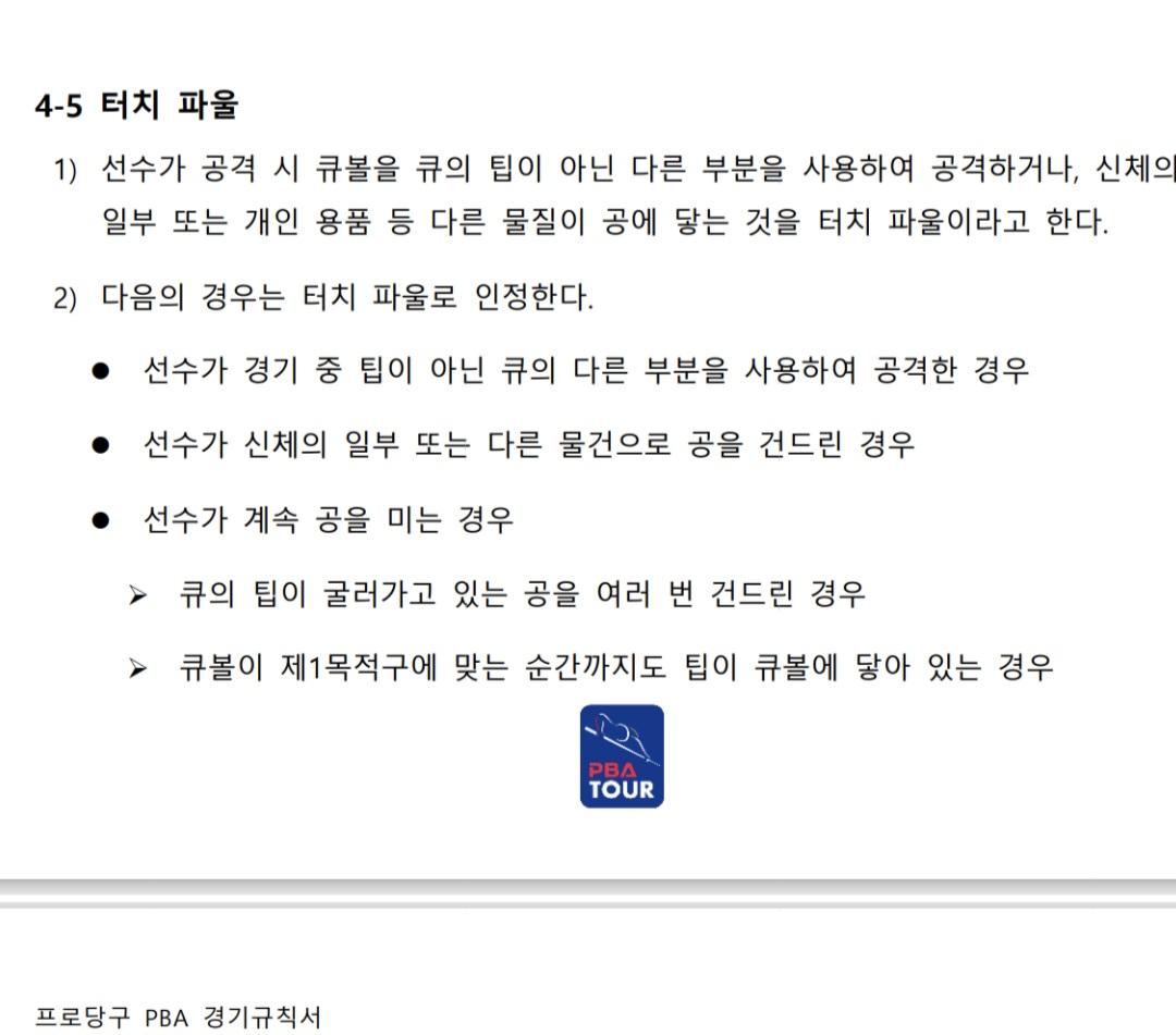 당구 경기에서 선수의 신체 어느 부위나 큐대 등도 닿으면 안됩니다.