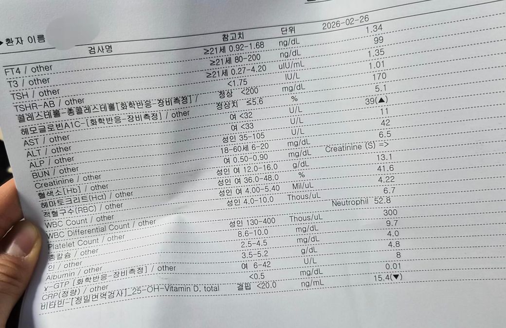 병원에서 초음파 상으로 갑상선 기능이 떨어진다고 했고 피검사를 했는데 수치는 정상인데 비타민D수치만 떨어져있다고 했는데