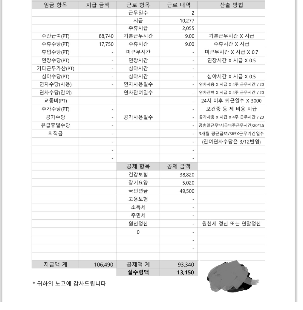 항상 세금은 9만원이상때갔는데 저는 그 이유가 일한시간에 비례하여 계산이 되는줄 알았습니다.