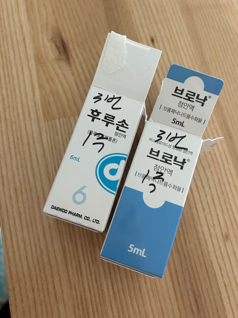 후루손,브로낙(망막멸공 레이저 치료 이후 받은 안약)을