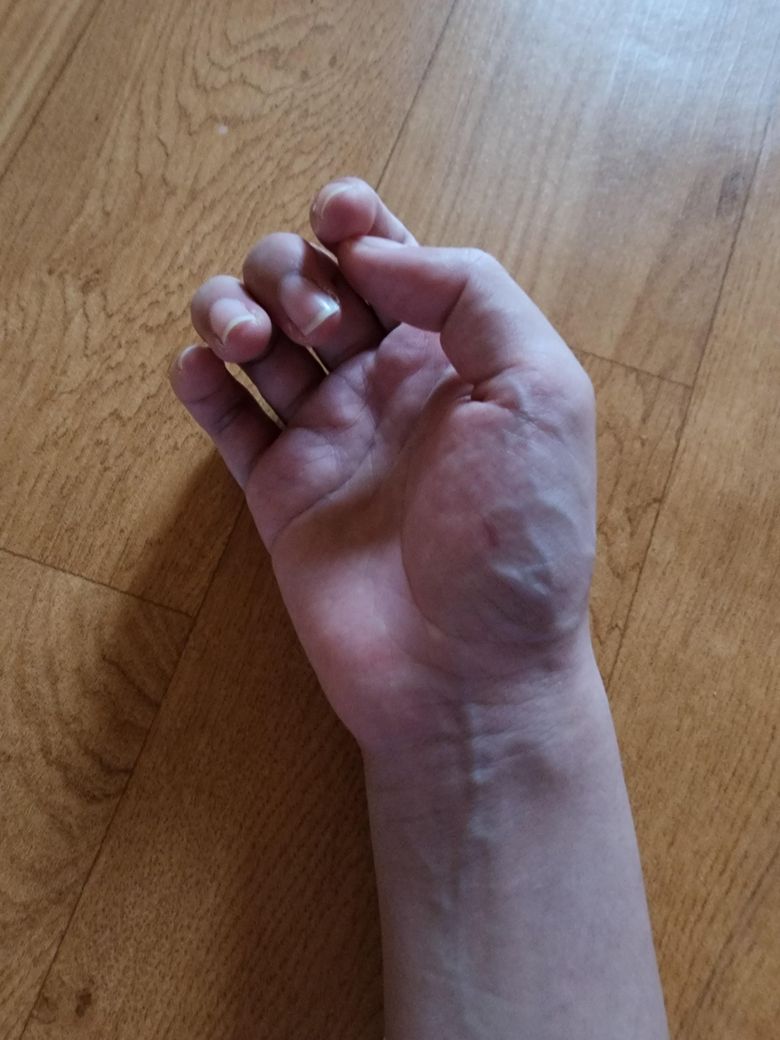 네 일하실때 무거운 물건을 자주 들고내리는 중에 손의 근육이 과부하 걸려 내부에 혈관도 부풀고 압력이 높아졌습니다