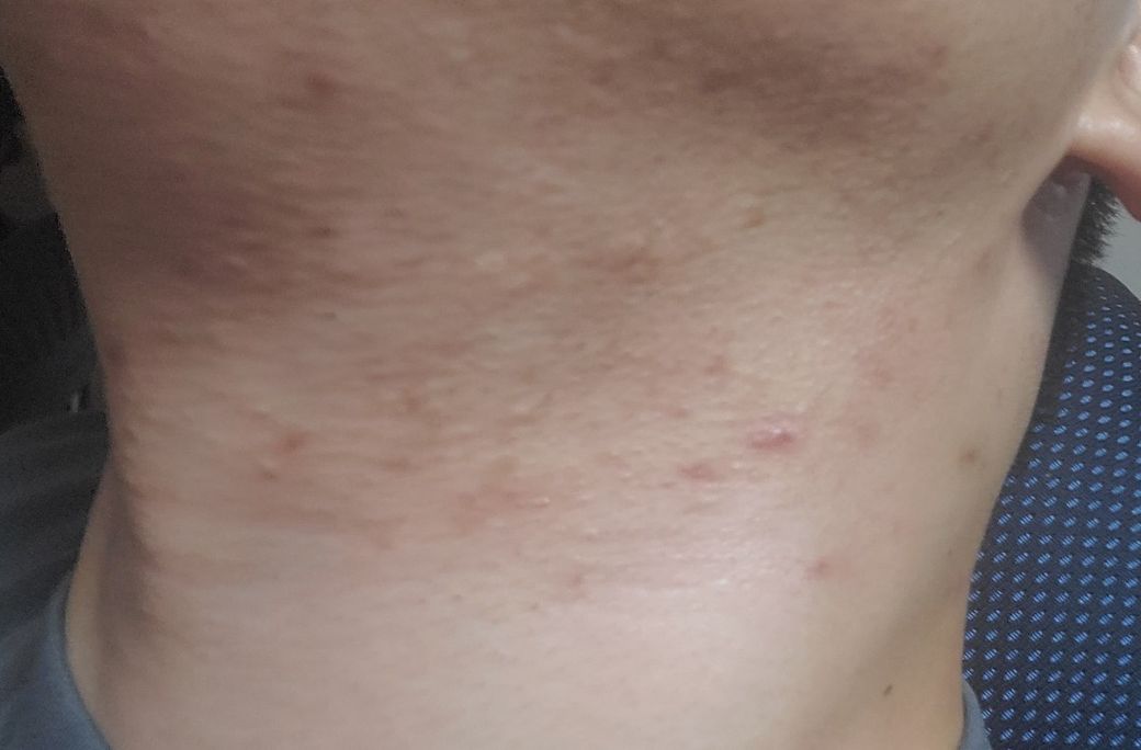 현재 피부 트러블은 모낭염 혹은 여드름의 일종에 해당하는 것으로 보입니다.