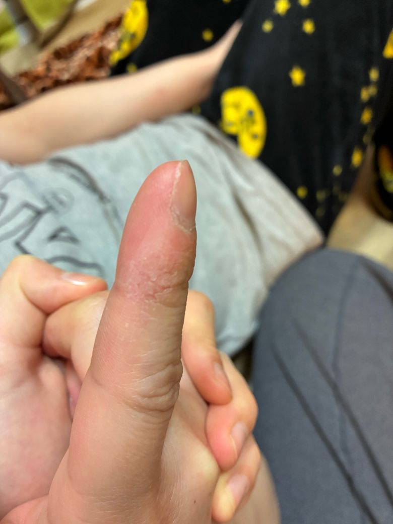 사진에서 보이는 양상은 엄지 피부가 건조해지면서 각질이 일어나고 갈라지는 형태입니다. 겨울에 반복되고 마찰 이후 시작되었다는 점을 고려하면 가장 흔한 원인은 수부 습진(손 습진, hand eczema) 또는 겨울철 건조 피부염(xerotic eczema) 가능성이 높습니다. 드물게는 만성 자극성 접촉피부염이나 국소 각질증 형태로 지속되기도 합니다.