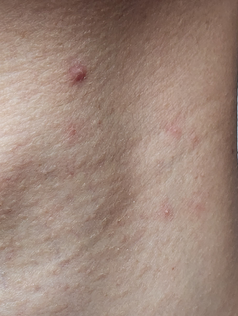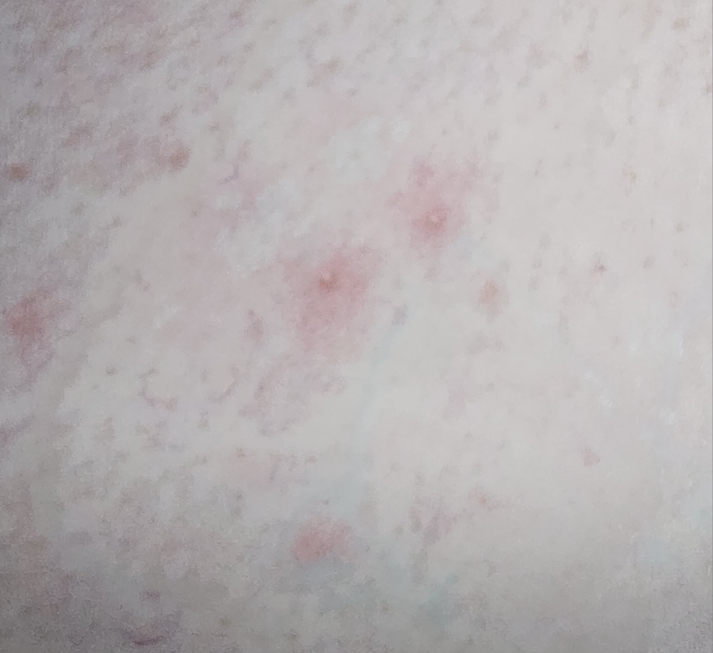 여름이라서 땀이 많이 난 것 같아요. 모낭염하고 땀띠하고 동반된 것 같습니다. 하얗게 된 부위는 모낭염 같고 항생제 연고 사용하면서 기다려 보시기 바랍니다. 땀이 나면 바로 씻고 말려 주셔야 땀띠는 안납니다.