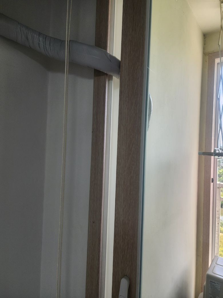 자가이며 거실 스탠드에어컨은 배관구멍에 연결했고 안방에 벽걸이에어컨을 달았는데 기사님이 벽을 못 뚫는다고 이렇게 해놓고 가셨습니다..샤시에 구멍도 못내준다하고 에보샷 추천하던데
