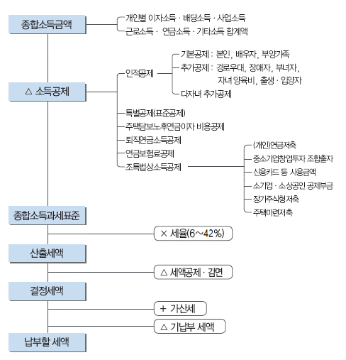 종합소득금액 계산시 사업소득에선 필요경비를 차감하고(프리랜서 소득의 경우 단순경비율 적용 가능), 근로소득에선 근로소득공제를 차감합니다. 종합소득금액에서 상기 나열된 소득공제 항목들을 차감한 것을 '과세표준'이라 하는데, 과세표준에 세율을 곱하여 산출세액을 계산합니다.