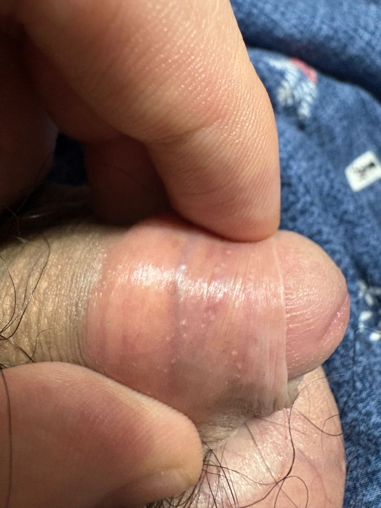 사진상 병변은 음경 관상구(coronal sulcus) 주변에 다수의 작고 균일한 백색 내지 피부색 구진이 배열된 형태로 보입니다. 표면은 매끈하고, 군집된 수포가 터지며 궤양을 형성한 흔적은 관찰되지 않습니다. 임상적으로는 진주양 음경구진(pearled penile papules) 가능성이 가장 높습니다.
