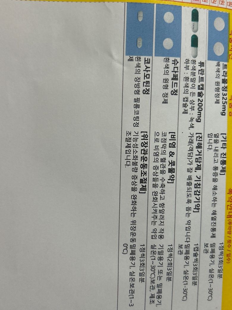 자느라 아침약을 못먹었는데 점심약부터 먹어여할지 아침약부터 먹어야할지 모르겠어요. 약은 트라몰정,튜란트캡슐,슈다페드정,코사모틴정 이에요