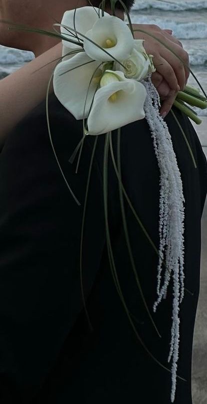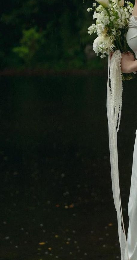 사진으로 확실히 구분되지는 않지만 흰색 등나무 꽃으로 보입니다. 결혼식과 잘어울리는 하얀색의 색상과 우아하게 늘어지는 모양 때문에 부캐에 종종 사용되고 있습니다.