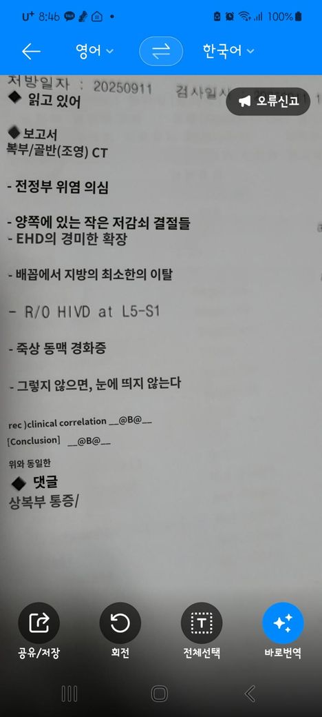 ct결과인데 궁금하여 변역기를 돌려 보니 이런결과가나왔어요..그때담당샘께서는아무말없었는데 검색해보니 괜실히 겁이 나서 선생님들의 도움을 받고자 합니다