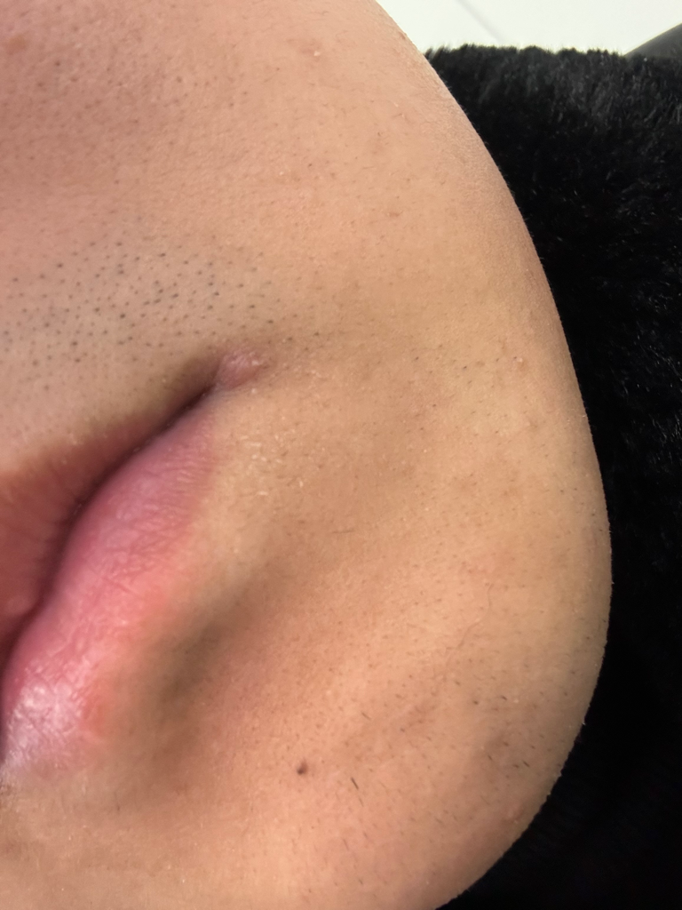 수포성 병변이 없으니 헤르페스는 아닙니다.