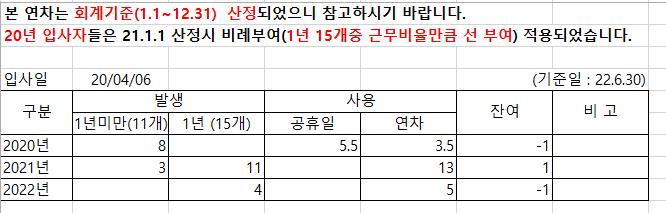 * 21년(1월기준) 연차+3개 4월5일 기준 12개 = 총 15개 발생에서 작년 -1개 차감하여 총 14개 중 총 13개 차감