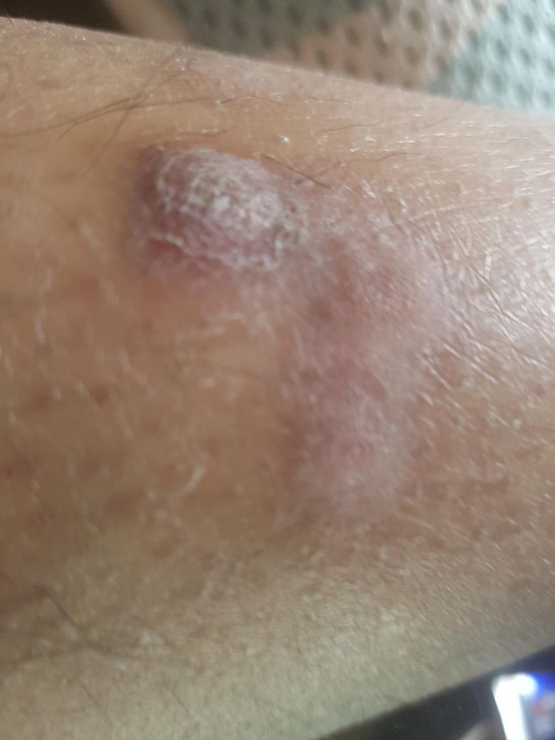 두 번째는 통증 없이 반복되는 양측 정강이 병변, 경계가 비교적 뚜렷하고 각질이 동반된 점을 보면 습진성 피부염(특히 건성 피부 기반의 화폐상 습진) 가능성이 우선입니다. 정강이는 피지 분비가 적어 건조로 인한 염증이 흔하고, 호전과 재발을 반복하는 경향이 있습니다.